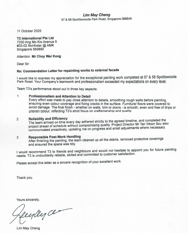 “We wish to commend the painting works performed at Ava Towers by T3 International Pte Ltd. They have done an outstanding job ensuring that the painting is done thoroughly and with great care.